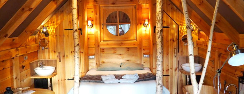 Des lumières tamisées, par des effets d'optiques tels que des vitraux, des lumières artificielles douces : en appliques, guirlandes, lanternes… fabriquées ou insérées dans le bois.